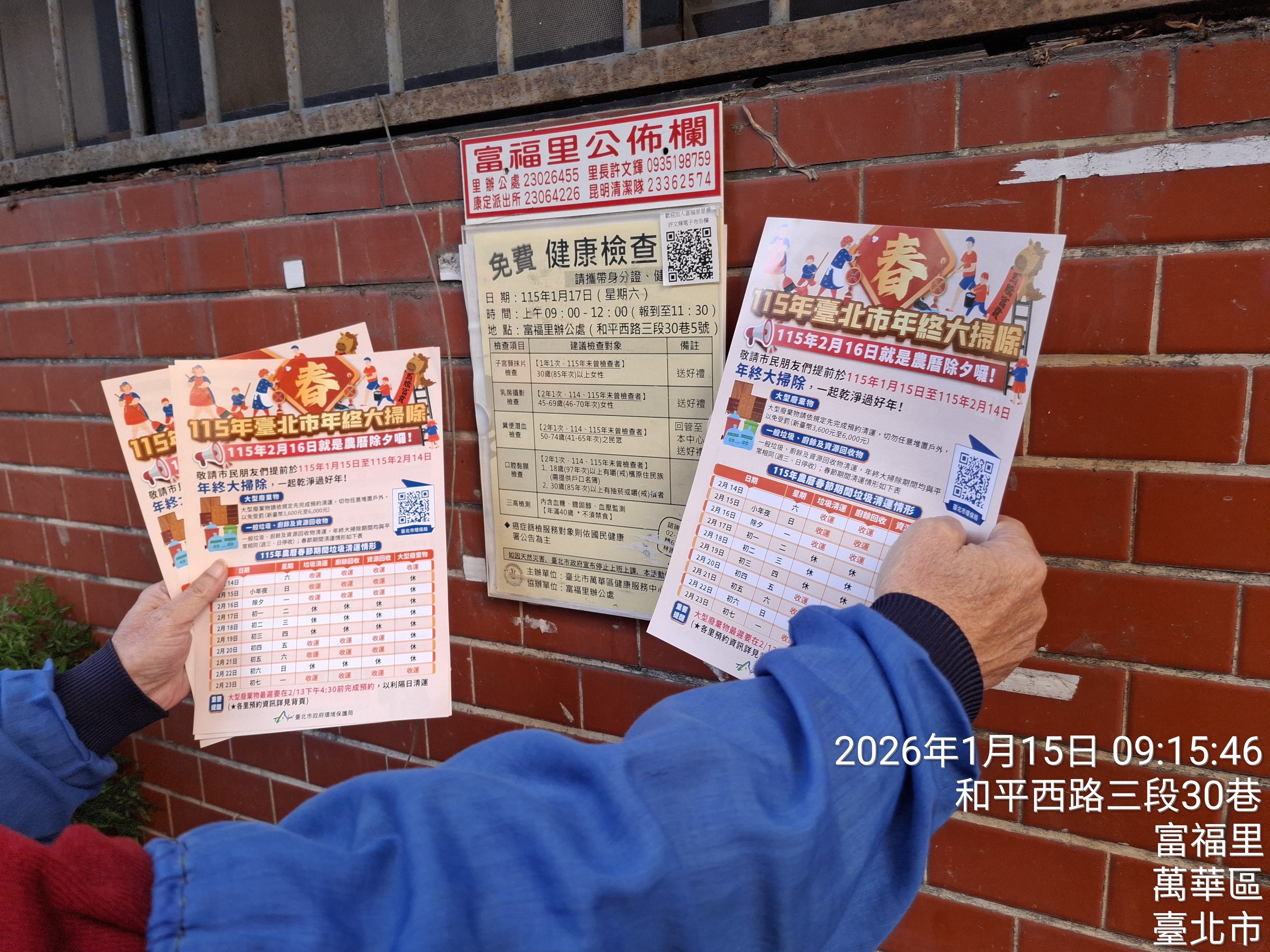 💥12150115富福里「年終大掃除活動」💥💥 活動時間:1月15號<四>上午9時里辦公處簽到集合。💥請協助動員志工10-12名里辧集合誓師後進行清淨家園活動。💥注意:保暖/口罩/手套/長褲。💥宣導: 臺北市小年夜、除夕、初四加收垃圾,初一至初三、初六停收垃圾💥許里長率領里鄰志工及社區協會理事長陪同等共同年前清理家園。💥 另感謝環保局昆明清潔隊隊員協助清淨轄里,有您有大家,富福好幸福。