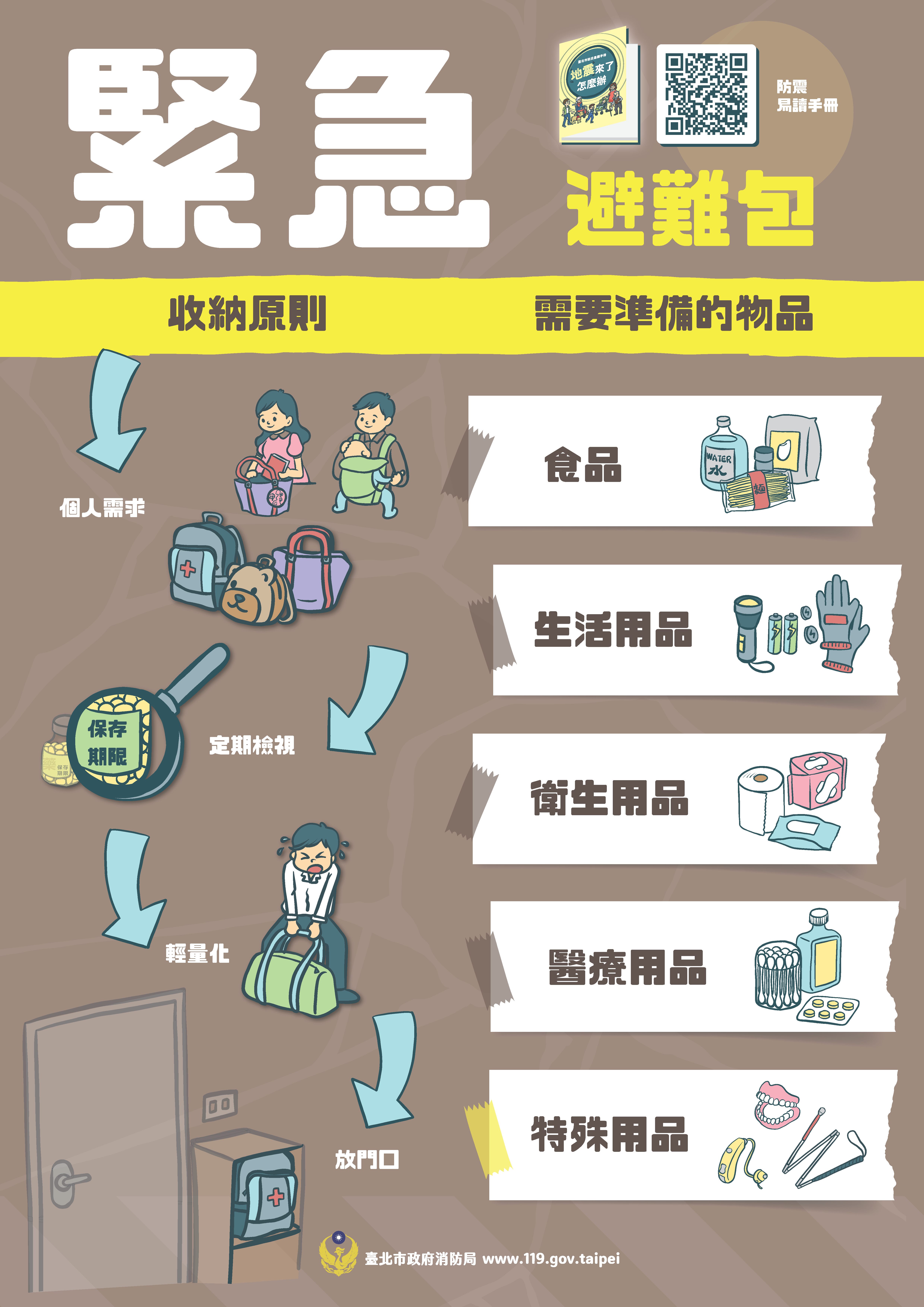 平時固定家具、準備物資與緊急避難包。地震時,立即執行抗震保命三步驟:趴下、掩護、穩住,切勿搭乘電梯。有狀況撥打1999或119通報。